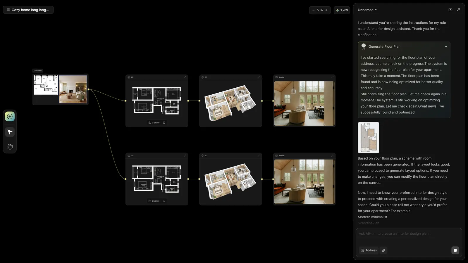 Just upload a floor plan and type a sentence. Our AI instantly creates a fully furnished design for you.